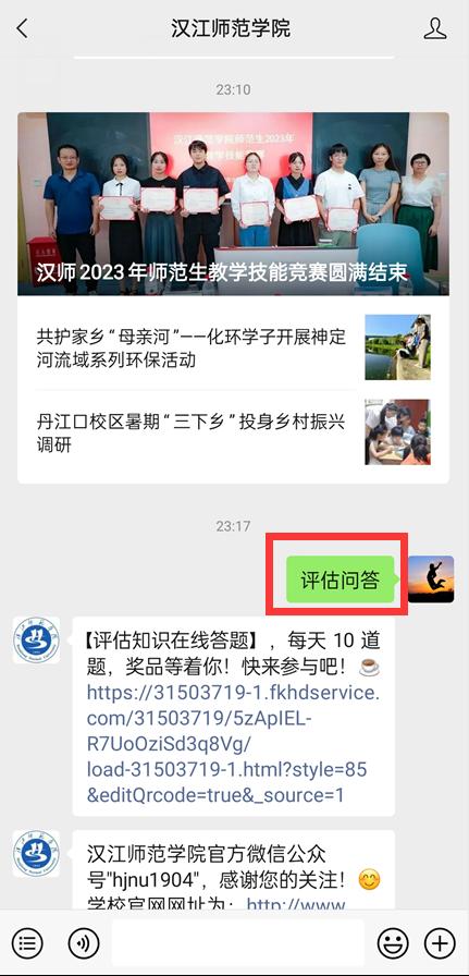 也可在“汉江师范学院”官方微信公众号底部菜单处“互动服务——评估问答”点击链接,或者私信输入关键词“评估问答”,即可获得答题链接。