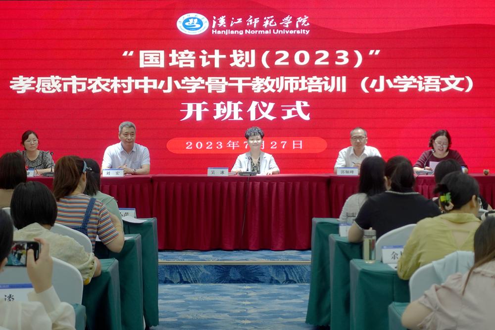 7月27日上午,“国培计划(2023)”——孝感市农村中小学学科骨干教师培训(小学语文)开班仪式在堰丰酒店七楼会议室举行。党委常委、副校长吴冰,继续教育学院院长刘宏、教育学院院长郭顺峰、教师周健,以及选派的50名骨干教师参加开班典礼。开班典礼由教育学院谢忠凤教授主持。
