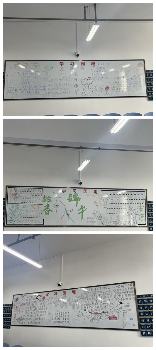 端午节是中国传统节日之一。2009年9月,联合国教科文组织正式审议并批准中国端午节列入世界非物质文化遗产,端午节成为中国首个入选世界非遗的节日。本次活动旨在以端午节为契机,让同学们充分发挥自己的想象力,以丰富的色彩、生动的图案和详实的文字,呈现出了端午节的起源、习俗、文化内涵等多方面内容。一幅幅精美的黑板报作品不仅体现了同学们对传统节日的深刻理解,也展示了他们良好的艺术素养和团队协作精神。
